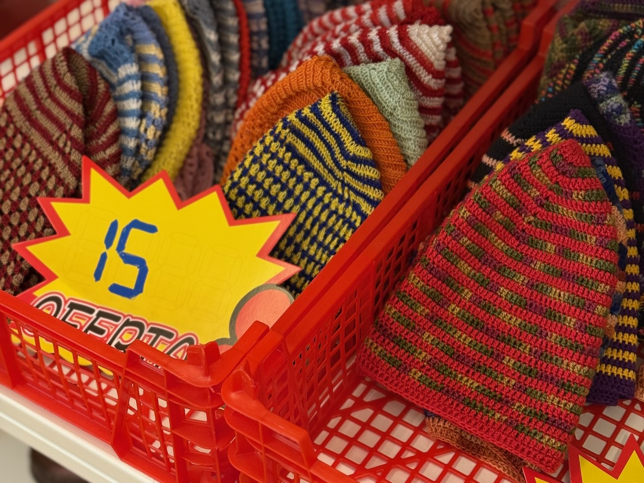 On y découvre une sélection de pièces de mode issues d’une coopérative marrakchia, parmi lesquelles des bonnets traditionnels tricotés main par des artisanes, véritables orfèvres de l’aiguille.