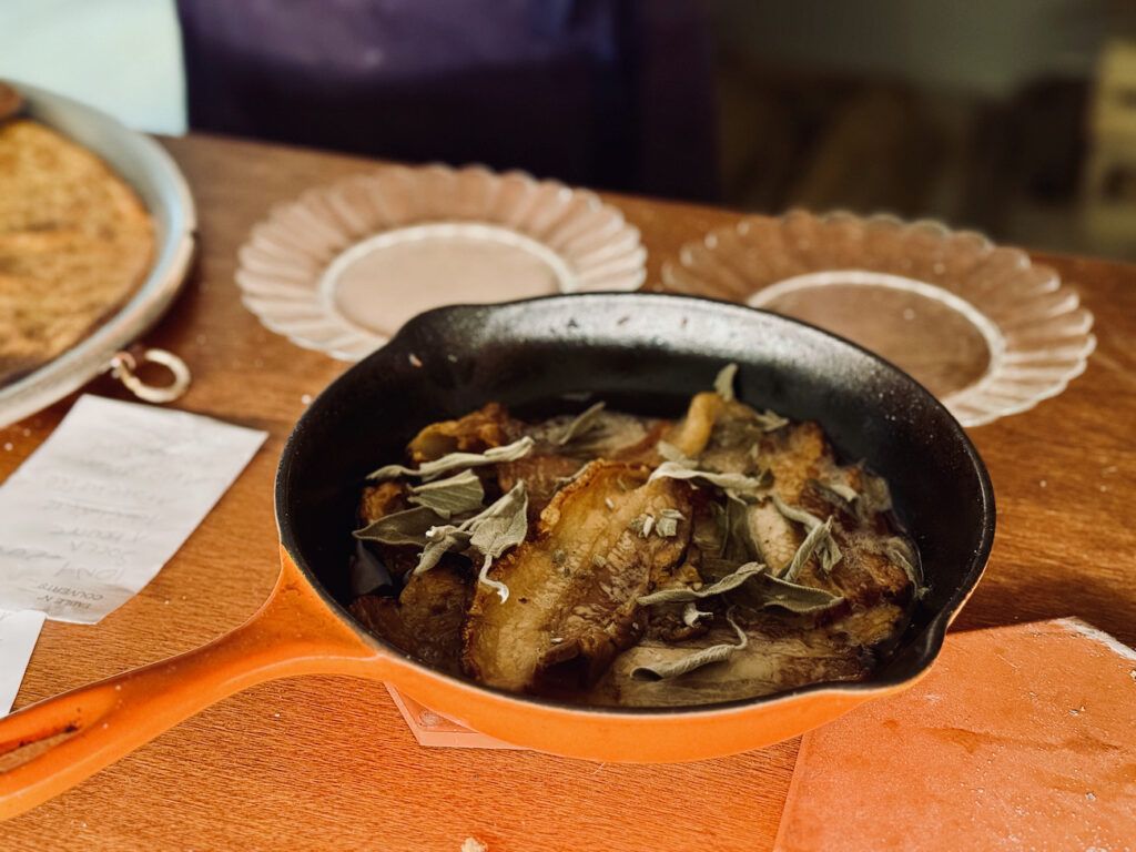 La nuit, dans la chaleur du four éteint, cuisent aussi des viandes à l’instar – ces jours-ci – d’un agneau magnifié par l’essence du bois.