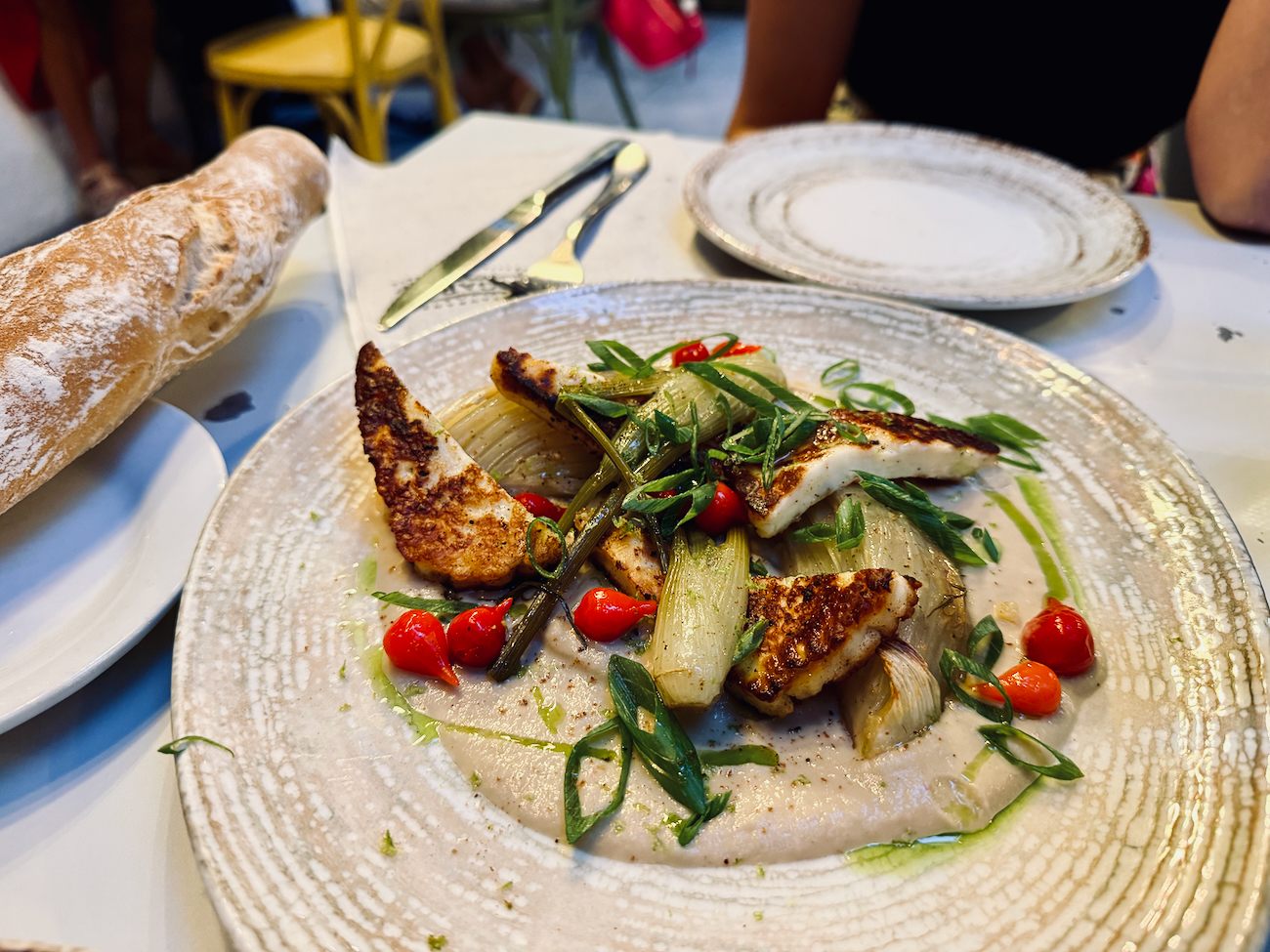Ce soir-là, l’entrée sur laquelle nous avions jeté notre dévolu associait le fenouil travaillé en deux textures — en mousseline aérienne et en version braisée plus gourmande — à de belles tranches de halloumi légèrement grillées. Suivait un saumon dont la cuisson frôlait la perfection, juste nacré au cœur.