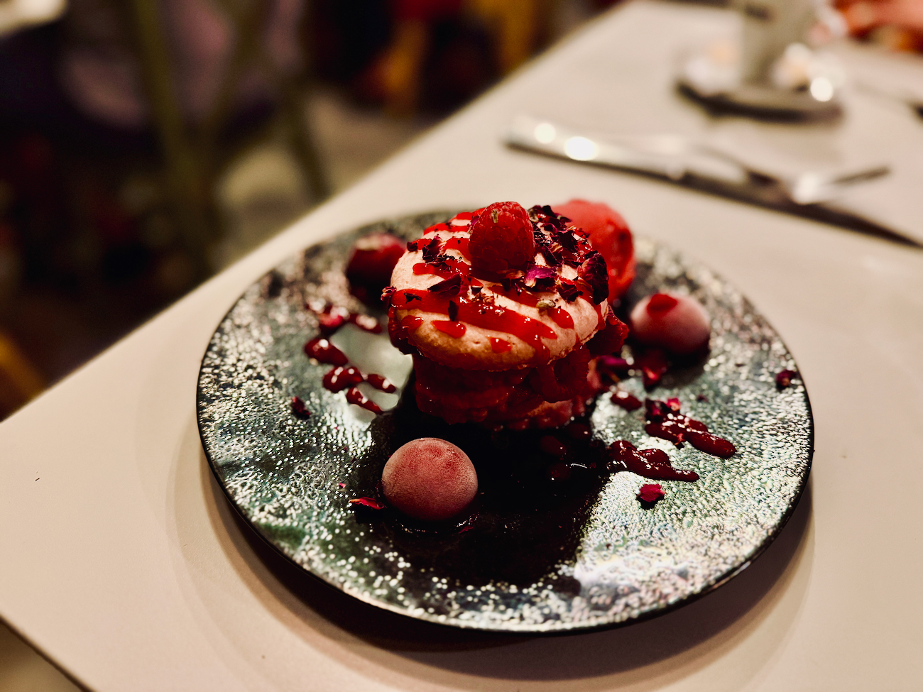 Le repas s’achevait sur un généreux macaron framboise-litchi, aussi élégant que savoureux.
