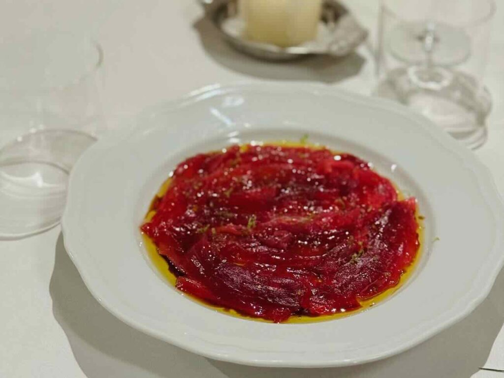 Les festivités s’ouvraient sur un artichaut grillé, nappé de l’huile d’olive du domaine de la Cavalière. De l’or liquide, saucé jusqu’à la dernière goutte avec le pain de campagne de la voisine, Carlotta With. Face à lui, un thon rouge (vif) ikejine fondant à souhait, lové dans le même nectar et à peine relevé de zestes de citron vert. Une mise en bouche parfaite.