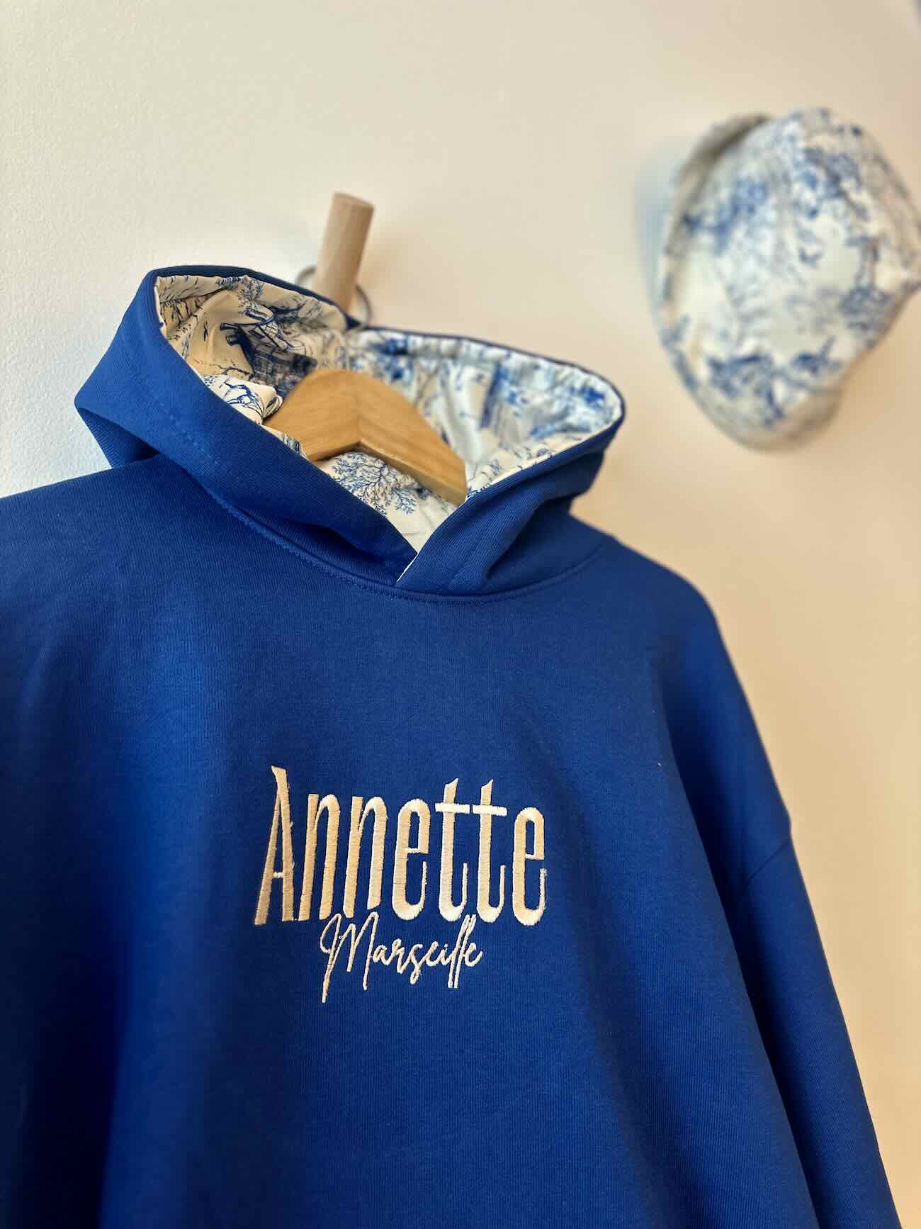 Ainsi ce motif de la toile de Jouy de leurs grands-parents – récurrent dans toutes la D.A du lieu – est revisitée avec malice en y glissant des anachronismes du quotidien moderne : perche à selfie, hoverboard, casque VR…
