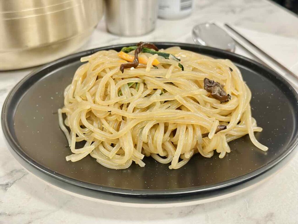 Le Japchae, plat coréen de nouilles de patate douce sautées avec des légumes était un must. Notre Bibimbap (bol de riz aux légumes et œuf au plat) avec un supplément bœuf était bon également mais nous aurions aimé que qu’il ait un peu plus de caractère et soit un plus épicé. La Ho-Glace composée d’un Hotteok chaud (sorte de pancake coréen) de glace vanille, pâte de haricot rouge et poudre de soja fut, elle, une merveille réconfortante en fin de repas.