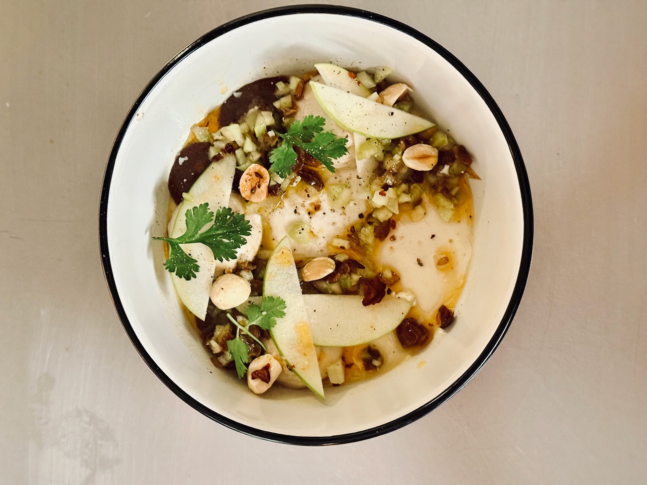 Ce midi-là, elle envoie un chawan mushi, flan salé nippon cuit vapeur pour une texture soyeuse, préparé à partir d’une purée de céleri, coiffé d’un praliné à l’ail confit et relevé d’un mélange poivre piment de Cayenne qui tabasse.