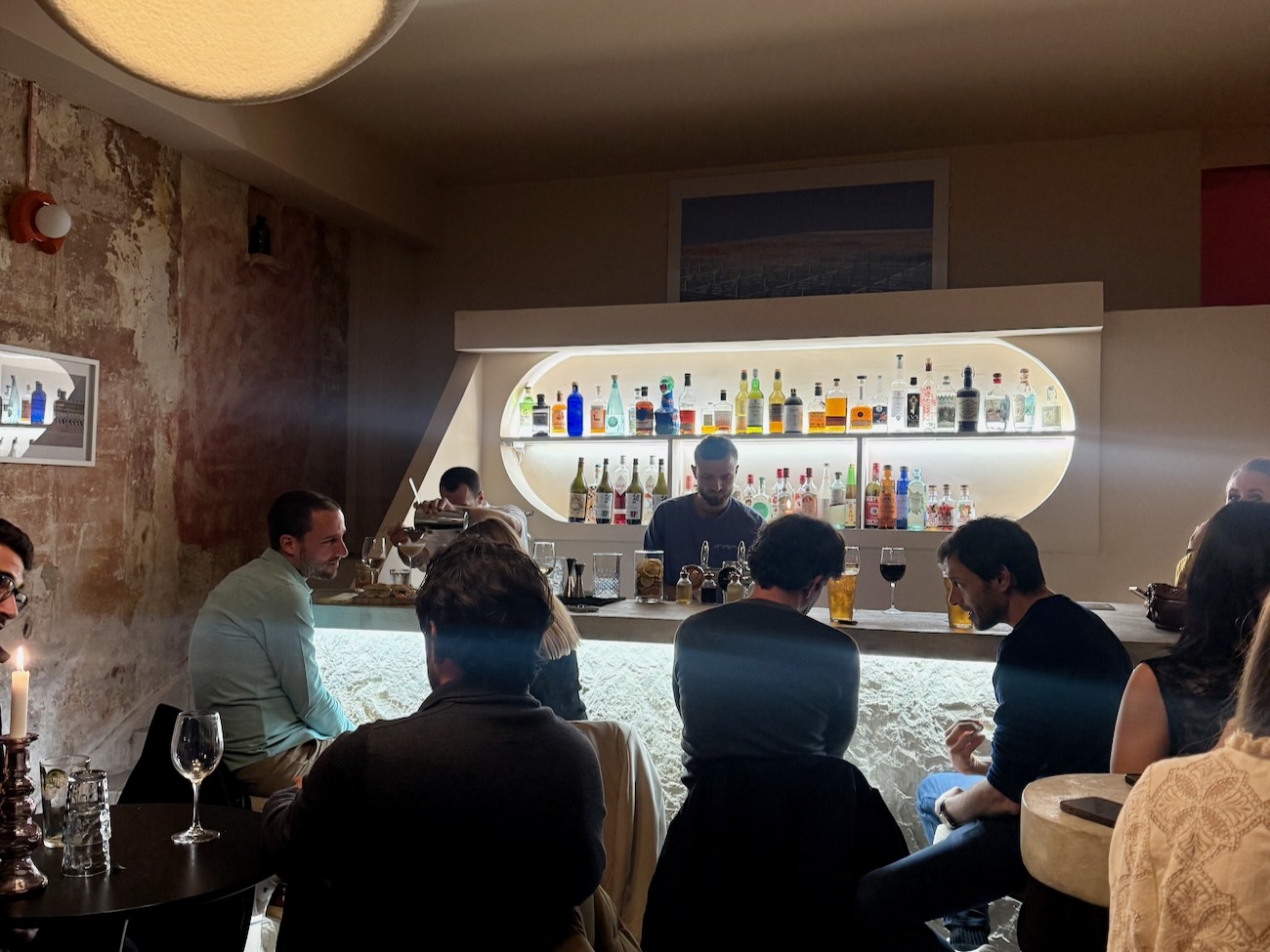 Dans le décor‑cocon qui marie minéralité et touches « space age », on distingue l’essentiel : un comptoir derrière lequel se dressent deux belles étagères de spiriteux.