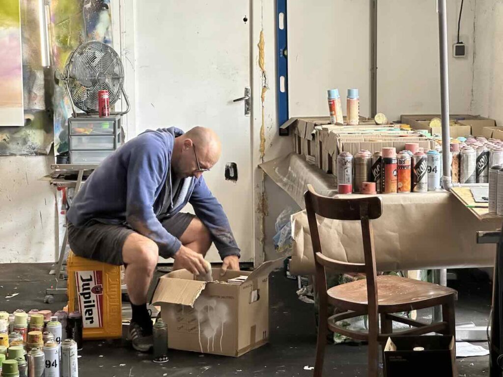 Quand nous l’avions rencontré pour la première fois il y a un an, il venait tout juste d’arriver à Marseille, ville dans laquelle il avait décidé de s’installer. Bien sûr le décor était plus vallonné et le ciel plus bleu que dans le plat pays de son enfance, mais il y découvrait beaucoup de similitude avec Liège, sa ville de cœur. Nous l’avons retrouvé dans cet ancien moulin du 13ème arrondissement où il a déballé bombes, toiles et châssis pour faire le bilan de plus d’un an de rencontres, de découvertes et d’inspiration au sud. Dans bordel organisé qu’il promet d’organiser au fil du temps, il s’affairait à terminer les dernières toiles de sa nouvelle série « Vortex chromatique » qui seront exposées à la galerie Diego Escobar qui le représente. Ou comment parler de Turner, Apéro, IA et paddle dans une même conversation…