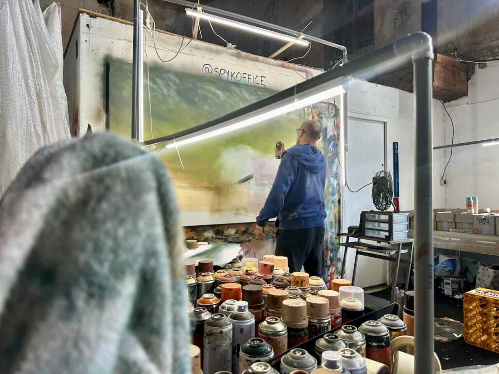 Ce lieu est formidable pour moi car je travaille à l’aérosol. Avec le temps qu’il fait ici je peux aérer très facilement pour ne pas m’intoxiquer presque toute l’année. Je n’ai pas besoin de travailler en manteau et je n’ai plus mal à la tête. En Belgique actuellement, il ne fait déjà plus que six ou sept degrés et ça va durer jusqu’à fin mars. L’espace intérieur est immense et dans son jus. Je m’y sens beaucoup mieux que dans un petit atelier design et blanc. J’aime ce côté capharnaüm même si je vais tâcher d’organiser tout cela un peu mieux