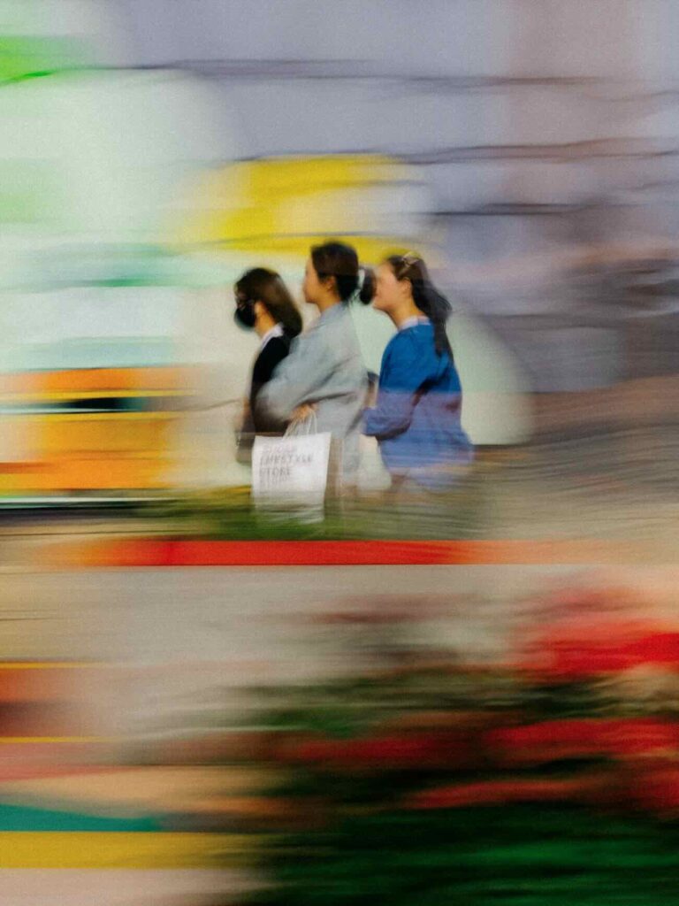 À Séoul, le rythme change : les passages piétons, les néons et les foules deviennent matière visuelle, transformés par le mouvement et la couleur.